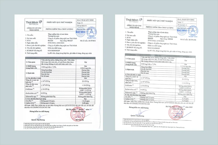 Vương Bảo được kiểm nghiệm định kỳ tại phòng thí nghiệm đạt chuẩn ISO/IEC 17025, với các chỉ số quan trọng: